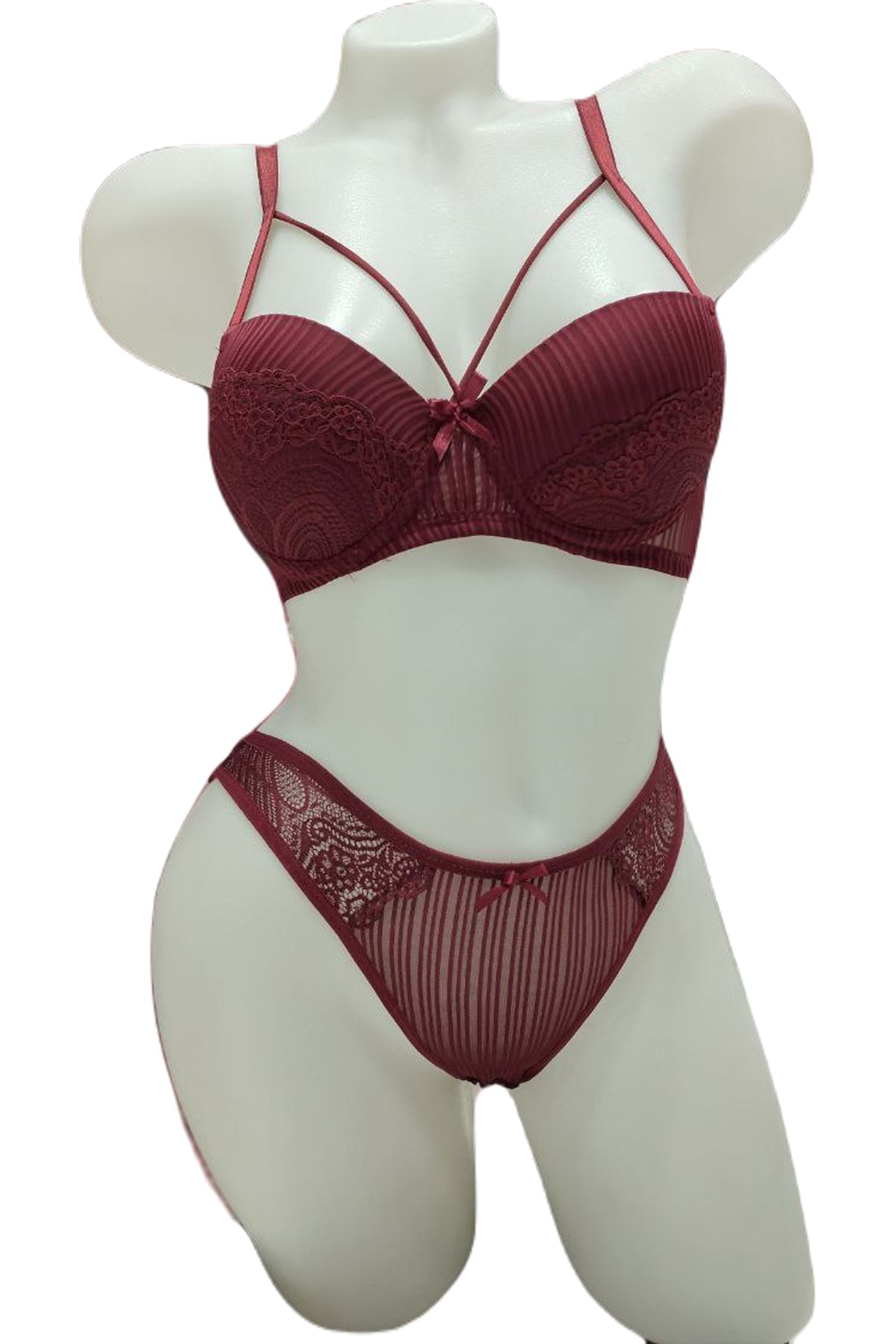 Kadın Çizgili Dantelli Destekli (Push-Up) Balenli B Kalıp Sütyen Takım